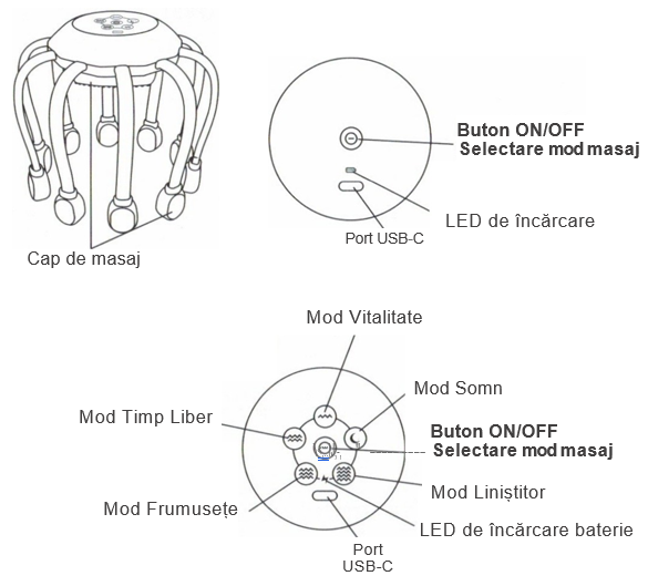 ★ Aparatul are 1 singur buton aflat în partea de sus a aparatului cu ajutorul căruia se pornește / oprește aparatul și se setează modul de masaj.