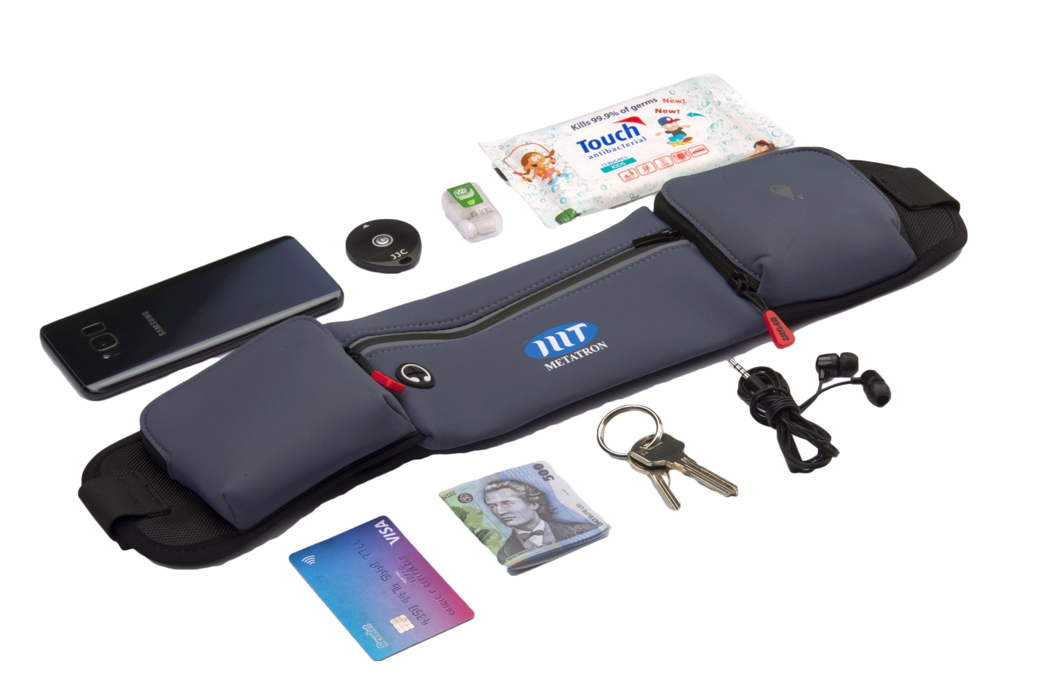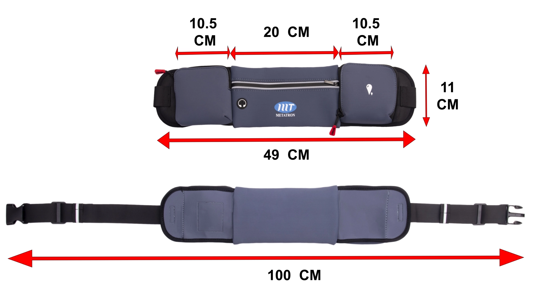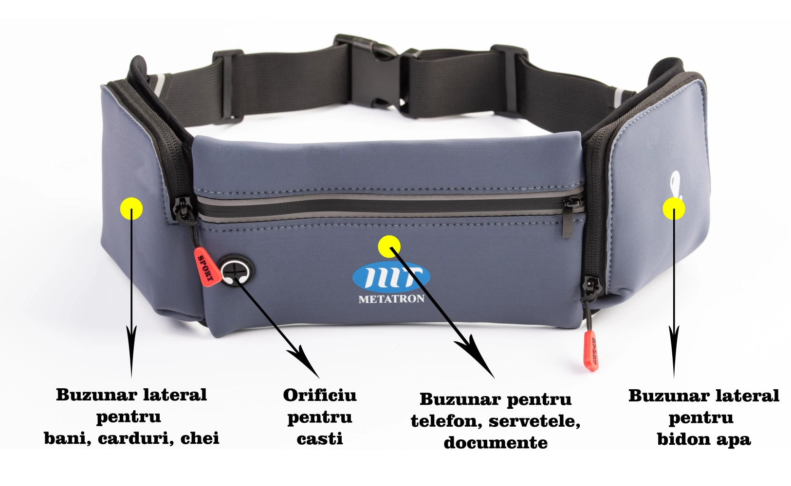 Centura sport include un buzunar mare (pentru telefon, documente, șervețele etc.) și două buzunare laterale, unul pentru bidonul de apă și celălalt pentru bani, carduri, chei și multe altele.