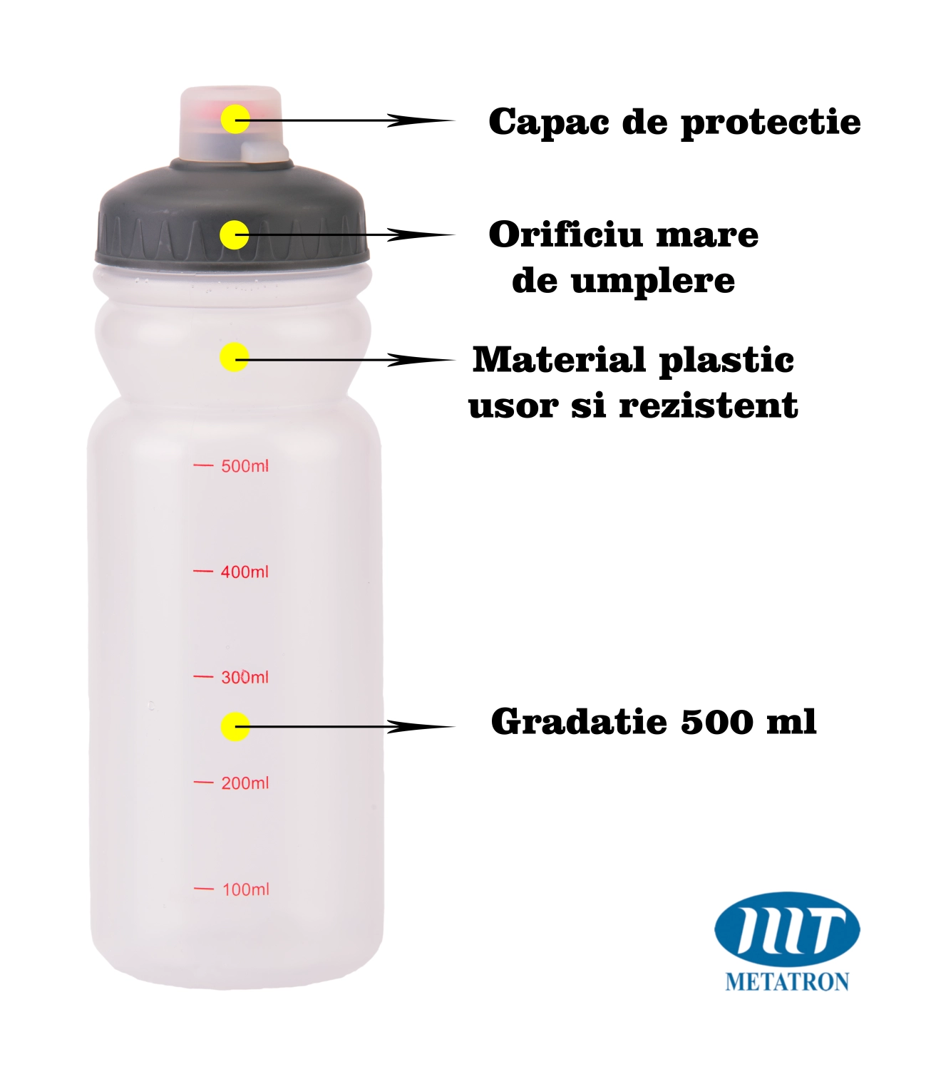 Deoarece este importantă hidratarea în timpul activităților sportive, borseta vine la pachet cu un bidon de 500 ml.