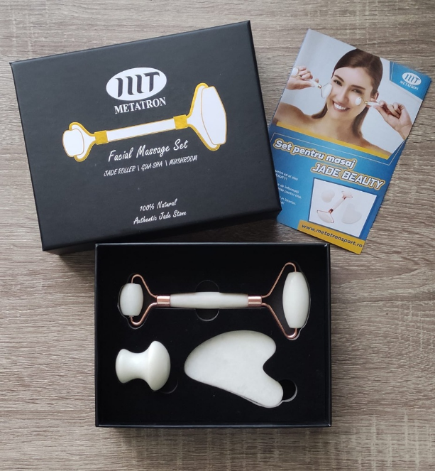 Descoperă METATRON JADE BEAUTY – setul din 3 piese de jad alb natural: rolă dublă, Gua Sha și piatră tip ciupercă, pentru masaj facial și revitalizare zilnică.
